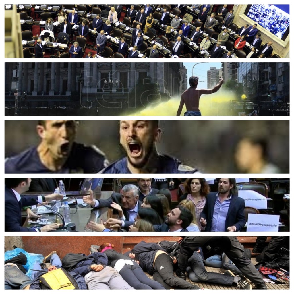 Y lejos, muy lejos de allí, «el tipo común» se aleja lentamente de los protagonistas de la comedia, harto de ver las mismas imágenes, de escuchar los mismos argumentos . Y entonces, los gerentes del FMI que obligan a votar un recorte inédito en los gastos en Educación, en Salud, en Obra Pública, consiguen sancionar lo que buscaban.Y los opositores mediáticos, consiguen hablar y se ocupan de dejar en claro que no. Que ellos no votaron, que ellos estaban tratando de impedir lo que, por lógica matemática no podían impedir. Y entonces, los «analistas» aprovechan para decir que si no lo podían impedir por la vía del voto, intentaron impedirlo ejerciendo la violencia. Y todos, absolutamente todos, dicen que esto no es democracia.