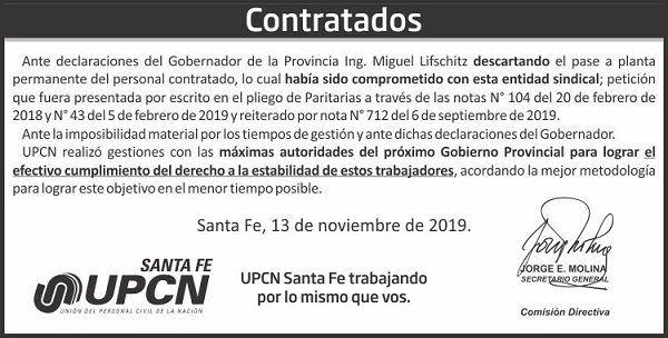 ATE se empieza a aparecer a la vieja ATE pre-socialista, y UPCN también. La cercanía con el poder los empieza a quemar y algunos empiezan a elegir el poder, antes que los intereses de sus afiliados. El «caso de los contratados» los pone en la incómoda situación de elegir intereses. Lifschitz decidió no correr con el costo del destino de los empleados en riesgo y expondrá a los gremios a la incomodidad de aceptar o rechazar el pase a planta de los «precarizados».