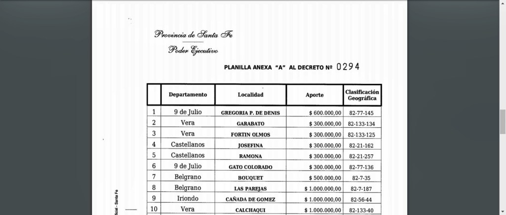 De acuerdo a lo descripto por los anexos que acompañan a ambos decretos, las localidades que más ayudas recibieron son casualmente las que pertenecen al Departamento Castellanos, territorio original del mandatario, entre las que se destaca Rafaela, con aportes de 2.500.000 pesos, pero también la pequeña Bella Italia, localidad gobernada por el primo hermano del gobernador, Héctor Perotti, que recibió en el comienzo de su noveno mandato consecutivo, 1.000.000 de pesos