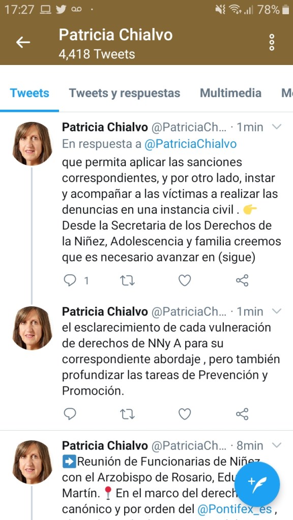 Pero por la tarde, otra funcionaria del gobierno provincial, ni más ni menos que la Secretaria de de los Derechos de la Niñez, Adolescencia y Familia de la Provincia de Santa Fe, Patricia Chialvo, hizo públicas unas fotografías con el Arzobispo de Rosario, Eduardo Martin, que fueron acompañadas por frases claramente justificadoras del nuevo mecanismo religioso de recibir denuncias.