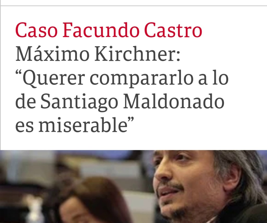 Mientras la madre de Facundo permanece al lado del cuerpo todavía no identificado, se lo escucha decir al Jefe del Bloque de Diputados del Frente Para Todos, Máximo Kirchner que «No se pueden comparar ambos casos, hacerlo es de miserables».