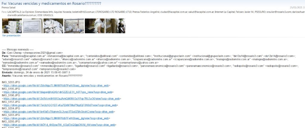 Pero no les alcanzó a Saín ni a Perotti. Como una réplica de lo ocurrido en diciembre pasado con mi cuenta de Twitter – @ocherep – suspendida por una denuncia masiva de cuentas falsas, en la tarde de hoy lanzaron a circular un email falso que lleva mi apodo y mi apellido como remitente, con una cuenta inexistente: cherepconirec2021@gmail.com, ventilando falsas denuncias sobre vacunas y medicamentos vencidos. Al meil lo acompañan fotografías de cajas de medicamentos y fotos de facturas presuntamente probatorias sobre el tema.