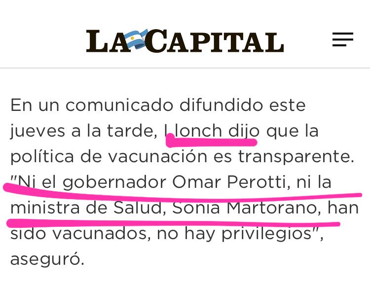 Sin embargo, repito, nadie hizo públicos los números de dosis que habían llegado hasta entonces, y fue la misma Ministra de Salud, Sonia Martorano, confirmó que un grupo de vacunas habían llegado a los nosocomios privados de Rafaela- especialmente a los pertenecientes a un grupo que ayudó a Perotti a ser gobernador- y a otros de Rosario. Martorano dijo explícitamente.