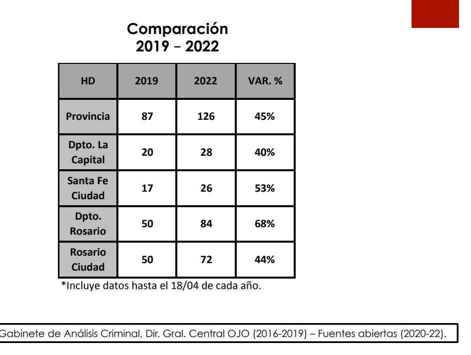 Los números son irrefutables: En 2019, el último año de la gestión de Miguel Lifschitz con Maximiliano Pullaro como Ministro, las estadísticas bajaban: ese año, a esta altura se habían cometido 87 homicidios. Una cifra que contrastaba con el sangriento 2018, que en el primer cuatrimestre había dejado 118. Si se comparan esos números con los de este año, el porcentaje se incrementó en un 45 % en la totalidad de la provincia. Esos mismos números arrojan diferencias de 68% en el Departamento Rosario y de un 40 % en el Departamento La Capital.