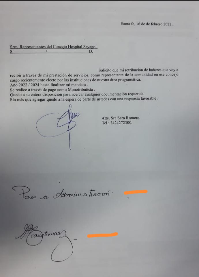 La mujer aceptó ser candidata a ocupar un cargo en el Hospital, por el que se lleva 148.000 pesos mensuales, que salen de la recaudación del propio efector. Para poder hacerlo, violando las normas de incompatibilidad tanto nacionales como provinciales y evitando el entrecruzamiento de datos, emitió un pedido por nota al Concejo (que ella misma forma) solicitando que le permitieran «facturar sus servicios» como Monotributista autónoma.