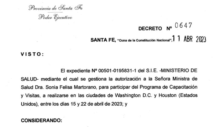 La fiesta turística empezó con la ministra de Salud, Sonia Martorano: Entre el 15 y el 22 de abril, y en coincidencia con el pico máximo del Dengue, en la provincia con mayor cantidad de casos del país, la precandidata a diputada provincial, eligió viajar a Washington y a Houston, para participar de un «Congreso de capacitación y visitas». Para la ministra, resultó prioritario su curso, antes que la salud de los miles de personas afectadas por la enfermedad, y sobre los conflictos vigentes en todas las dependencias públicas de salud, donde se está produciendo un éxodo sin antecedentes.