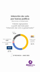 De acuerdo con los números publicados por Doxa, esta misma semana en sus redes sociales, el Frente UNIDOS, supera en intención de votos por casi 18 puntos de diferencia al Peronismo: Hoy la oposición, reuniría el 45,7 de los votos, contra el 27,1 % de JUNTOS (PJ).