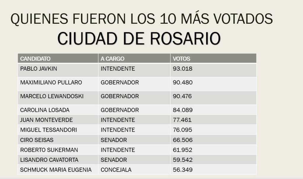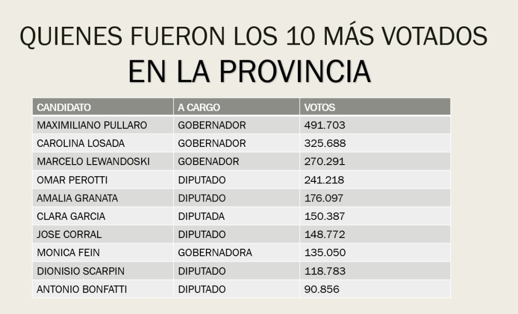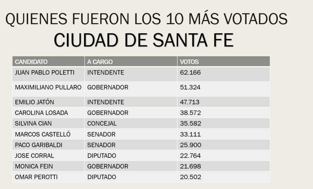 Maximiliano Pullaro y Carolina Losada son los únicos dirigentes que aparecen en la lista de los 10 dirigentes más votados en todo el territorio provincial y que figuran en el ranking de las 5 ciudades más importantes de la provincia: Rosario, Santa Fe, Rafaela, Reconquista y Venado Tuerto. Perotti fue décimo en Santa Fe, y no aparece entre los primeros 10 más votados de Rosario.