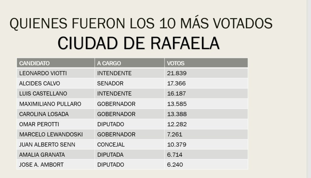 En Rafaela, el actual concejal de JXC Leonardo Viotti se impuso holgadamente sobre figuras como Alcides Calvo y Luis Castellano . Senador e intendente de la ciudad. Pullaro fue el más votado en categoria a gobernador, duplicando a su rival en las generales, Marcelo Lewandoski. El dato : Omar Perotti , quedó tercero entre los candidatos del peronismo en su propia ciudad.