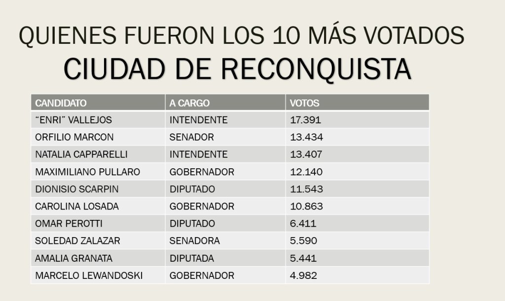 Finalmente en Reconquista, el actual intendente Amadeo «Enri» Vallejos, es el más votado en la ciudad. Por detrás aparece el senador Orfilio Marcón y su principal oponente, Natalia Capparelli. Pullaro fue el cuarto más votado, duplicando a Omar Perotti que aparece recién en el séptimo lugar, detrás de Dionisio Scarpin y Carolina Losada. Lewandoski ocupa el decimo lugar.