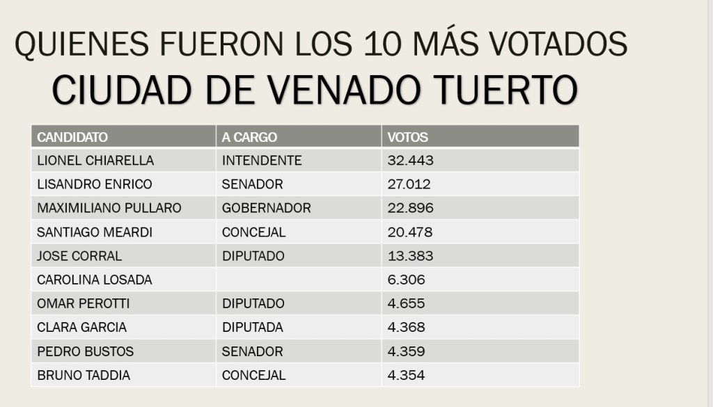 En Venado Tuerto, el intendente Lionel Chiarella se quedó con el Top-Ten. Por debajo de él, aparecen Lisandro Enrico y el candidato a la gobernación Maximiliano Pullaro. El candidato del peronismo a la gobernación, Lewandoski, no aparece entre los 10 más votados, mientras que el gobernador aparece séptimo. El concejal Santiago Meardi obtuvo más de 20 mil votos.